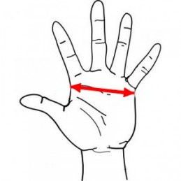 To find your glove size, measure around your hand at the place indicated by the red line on the drawing. (just below the fingers).