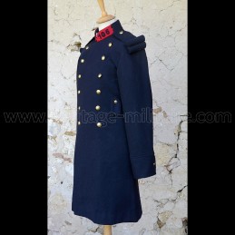 - une capote bleu marine, épaulettes a rouleaux, et col rouge, avec double rangées de boutons, modèle grenade dorés (voir fiche de mesures à compléter) 345€
